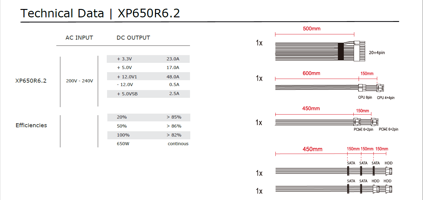 The black design of the power supplies and the elegant flat ribbon cables blend visually into any PC build. The power supplies deliver stable voltages with high efficiency (80+ Standard) to meet the ErP2014 standard. The integrated black 120mm fan provides silent cooling. Four integrated safety circuits ensure safe operation at all times.